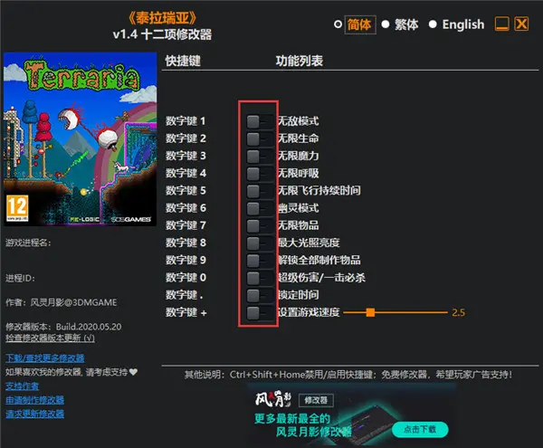 泰拉瑞亚十二项修改器是一款专为“泰拉瑞亚”游戏打造的修改器。它可以为玩家自定义修改游戏中无敌模式、无限生命、无限魔力、无限呼吸、无限飞行持续时间等数据。适用于当前最新版本,玩家可以通过修改这些功能从而降低游戏的难度,同时可以让玩家享受游戏带来的的乐趣。修改器操作非常简单,上手也很容易,对于喜欢玩泰拉瑞亚这款游戏的玩家非常实用。