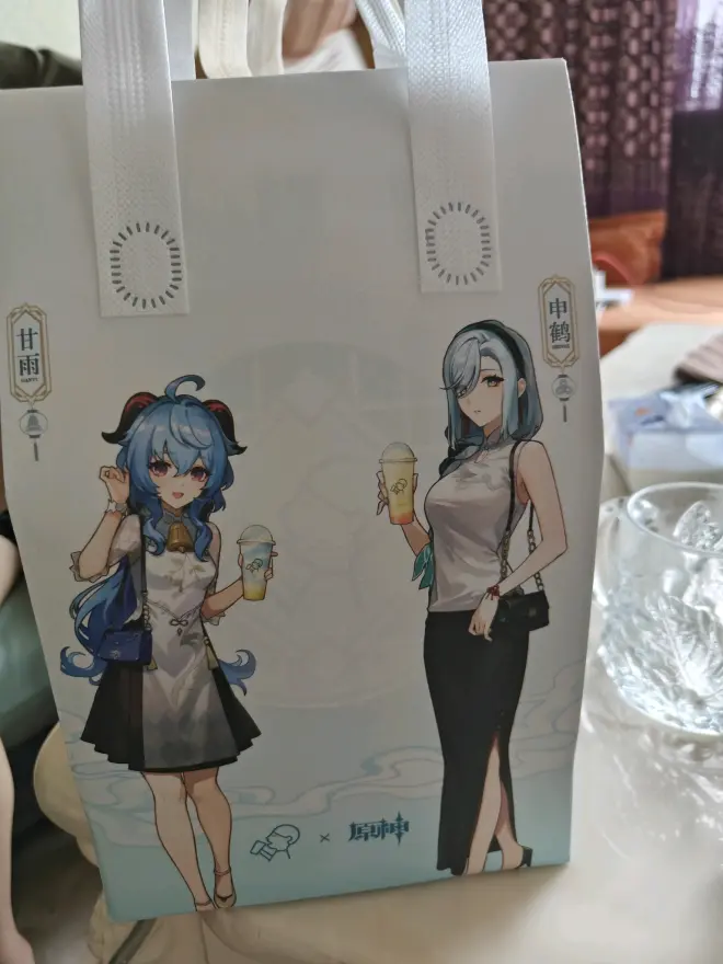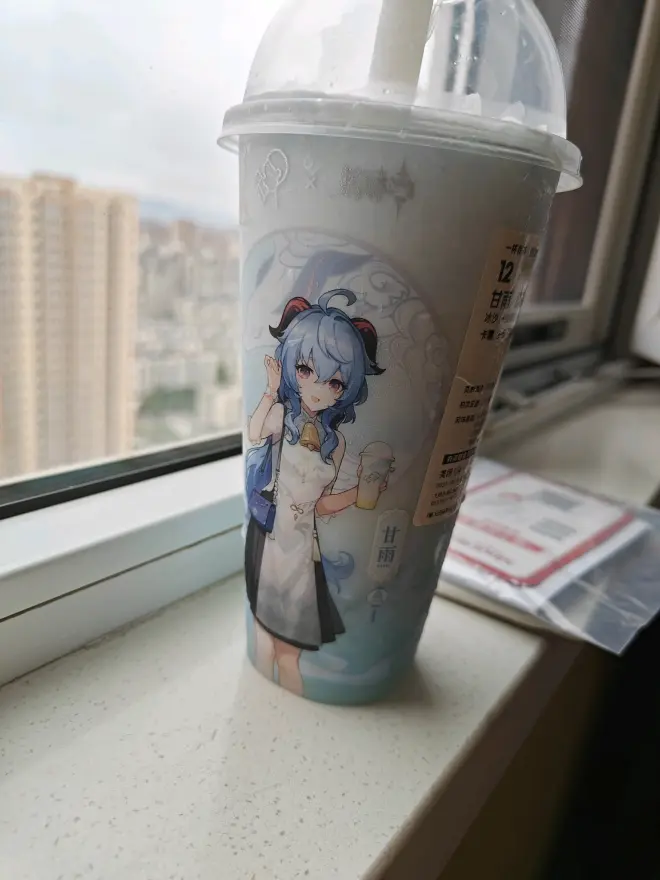 甘雨的这一款最亮眼的就是杯壁蓝色摸边而饮品实际是黄色调的(直接惊艳到我的表姐ಡωಡ),参考了游戏中她的特色料理盛世太平的配色。 名字下面的小铃铛真的可爱