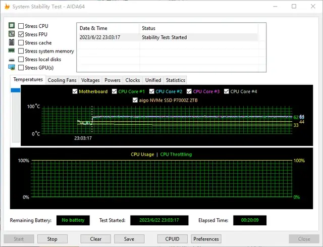 拷机20分钟,温度与功耗趋于稳定,AIDA64测试,CPU 所有核心温度均在40℃左右,CPU package的温度也是64℃左右。