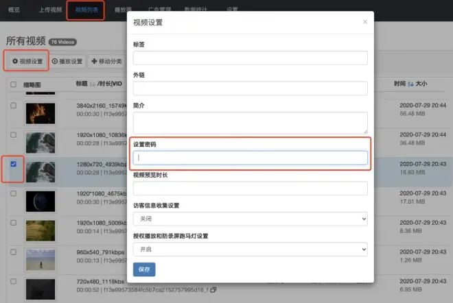 第1步:登录点播管理后台,点击【视频列表】,选中视频后点击【视频设置】,为视频设置密码。