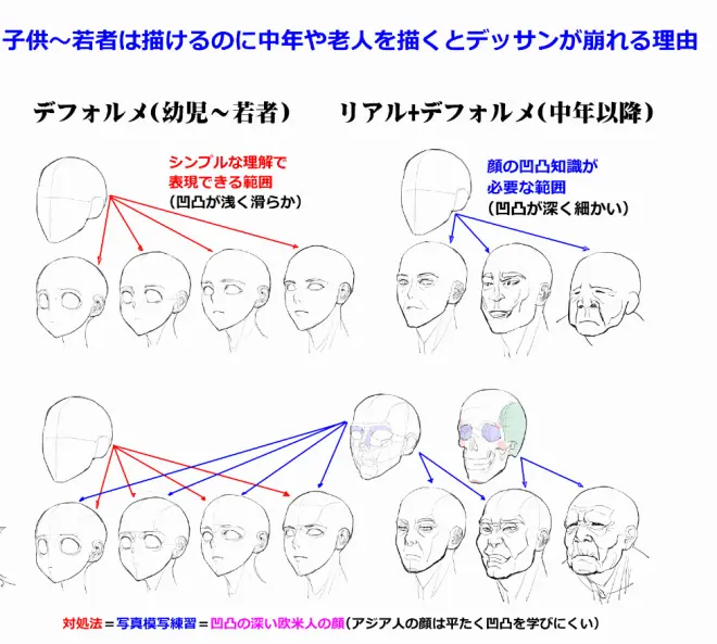 很多人都画不好头,首次得把头部骨骼结构理解清楚,同时不同年龄阶骨骼也不一样。