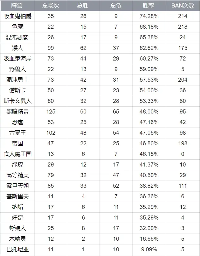 纵观整个23年春季赛季,秩序阵营几乎彻底沦落为下水道,胜率前10仅有矮人一家独撑门面,不过好在新版本马上就要到来,各派系所在的生态位可能会发生较大变化。