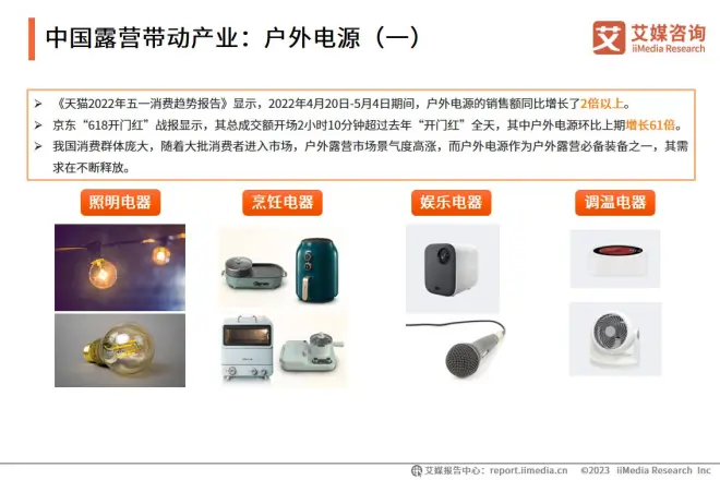 露营经济爆火还带动了户外电源市场的发展。随着中国消费水平不断提高,人们对于露营的追求也日益多元化和精致化。户外精致露营最大的难题往往便是电,无论是手机、笔记本等随身电子设备,锅、壶等烹饪电器,灯带、台灯等照明电器,投影仪、卡拉OK机等娱乐电器,还是风扇、制暖炉等调温电器,都离不开电力供应。