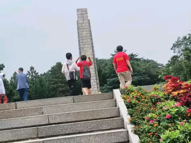 7月1日下午 -实践团继续前行,他们眼前所见是一排排烈士墓碑。墓碑上刻着许多耳熟能详的名字,如丁继海、苏建华等,这些都是无数英勇烈士的代表。每个墓碑都承载着他们为了国家和人民作出的巨大牺牲,令人肃然起敬。接着,实践团队成员们开始攀爬100多层的楼梯,直至达到顶部的刘一鸿纪念亭。站在亭子上,他们俯视着烈士们的墓碑和周围的天地,心中油然而生无法言喻的情感。亭子附近还有许多渡江战役无名墓碑,以及为扑灭8.2火灾而牺牲的三名消防员的纪念碑。