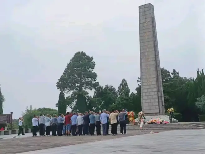 7月1日 - 在与当地有关部门的沟通交流后,实践团约定于建党节这一特殊日子,正式开启了红色基因传承的实践旅途。在濮塘红色教育基地,实践团成员与一些老干部和新团员一同前往烈士陵园,向革命烈士献上花圈,表达对他们英勇无畏精神的崇高敬意。