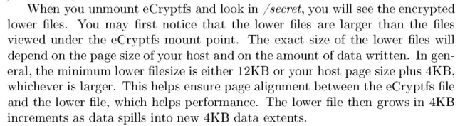 二是文件加密后大小变化问题,这个原因在于eCryptfs的方案本身设计。下图是eCryptfs明文和密文的映射关系及论文中的说明,分别出自2006年设计文档《eCryptfs v0.1 Design Document》和2007年论文《eCryptfs: a Stacked Cryptographic Filesystem》。从中可看出加密文件格式会多增加一个header信息(预留一个page)。对于文件内容则是按页分块加密。为了综合性能考虑,故使文件大小做到page对齐,最小12KB。