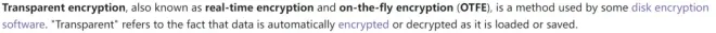 透明加密,也称作real-time encryption或on-the-fly encryption。特点是数据在使用过程中自动完成加解密,无需用户干预。