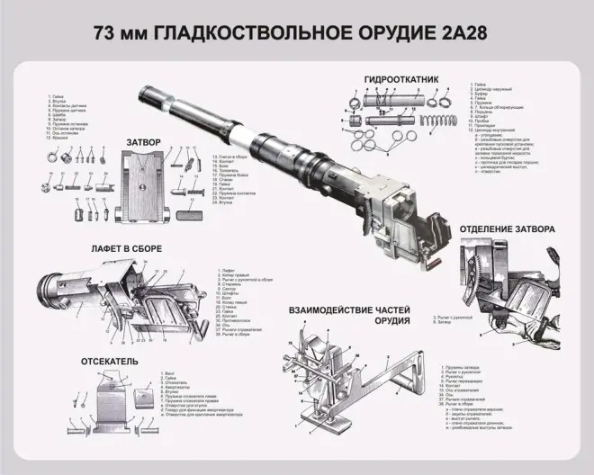 因为苏军给BMP的定位是一种伴随坦克进行支援的支援型车辆。所以苏联人要求BMP既能有效打击铁幕对面坦克和装甲车,又能打击敌方的步兵和野战工事。为了达到这个要求,在BMP的设计之初,就有30、37、45、57、73和76毫米的火炮可供选择。其中57毫米一下的使用常规动能弹药,57毫米以上的则使用HEAT这种化学能弹药。最终经过一番论证,73毫米的2A28火炮最终被选中,这种源自于步兵SPG-9无后坐力炮去掉了原版SPG-9的尾部喷口,并加厚了身管,摇身一变成了一种正经的低膛压火炮
