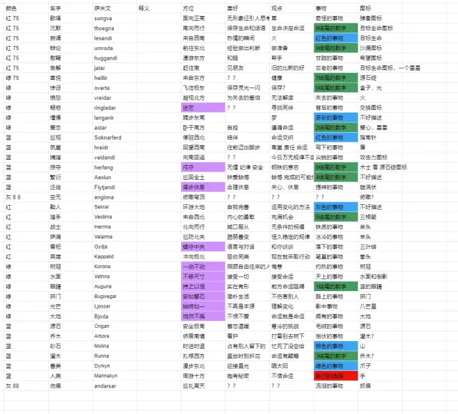 每个卡面可以分成:颜色 名字 方位 喜好 观点 事物 图标,粗略可以看出一些分类,但暂时感觉没有什么深入的头绪,可能要依赖进一步的信息;
