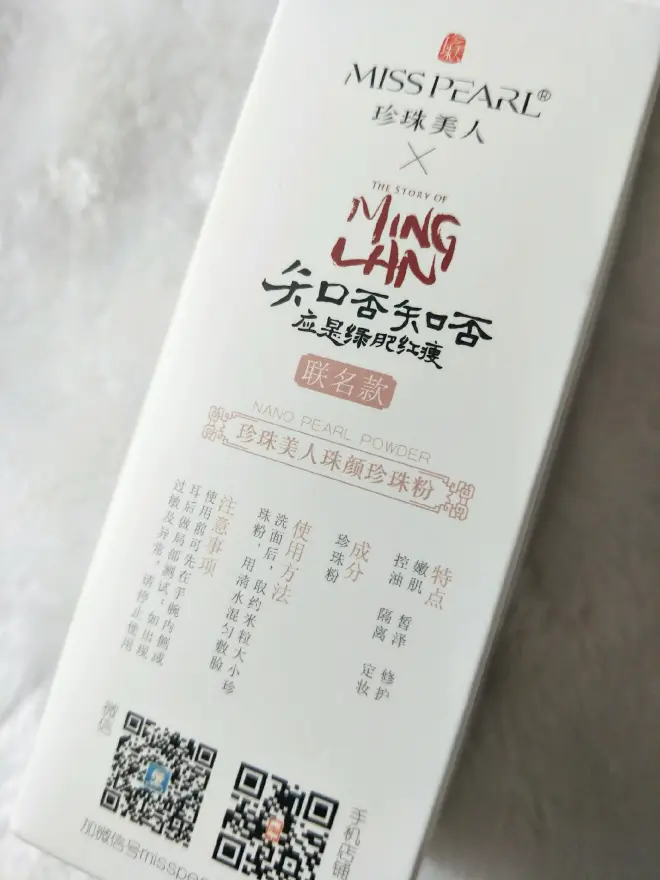 珍珠美人家的珍珠粉我第一次用,之前有用过其他牌子的珍珠粉,从粉的细腻程度上说确实是要高于我用的其他品牌,珍珠粉超级细腻,用爽肤水一点点就可以融化掉,非常好吸收,不用担心什么堵塞毛孔之类的,而且我买的这款包装是和知否的合作款,包装超级可爱,还会送带明兰的小镜子还有好多产品试用装,真的超级棒!这个珍珠粉闻起来稍微有点惺的味道,所以可以看出真的是货真价实的珍珠粉无疑了!