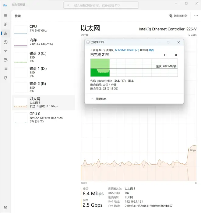 首先我们测试一下有线状态的内网速度,我将一个10G的文件复制到我的服务器里,可以看到速度基本已经跑满了2.5G的网口,速度在281MB/秒,相比于110MB/秒的1G网卡,效率提升了很多,可以节省不少时间。