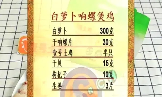 白萝卜300克,干响螺片30克,壹号土鸡半只,干贝15克,枸杞子10克,生姜3片。