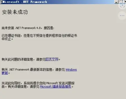 在安装 .netFramework 4.8 极有可能会提示证书不可信,提示如下: