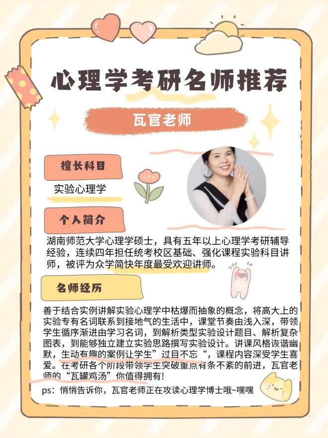 今天小木给大家揭秘,众学简快的宝藏老师们!因为名师太多,这次就只给大家展示312老师啦💯💯 ⭕凉音老师--普通心理学--北师大博士 学术论文20+,参编教材4本,畅销书大纲解析、逻辑图、心理学考研背诵手册作者!深受大家喜爱,本人谦逊温和、耐心,也被称为“凉音姐姐” ⭕大兵老师--心理统计学--211高校博士 统计拿捏的死死的,解决咱们大多数心理学考研难题,课程通俗易懂,讲懂知识同时带一些幽默~有幸见过大兵老师本人,哈哈,人很害羞,和讲课对比有点反差萌😂 ⭕赛克老师--心理测量学--北师大博士 多篇SSCI、CSSCI论文坐拥者,民间传闻一篇相当于一套房🔥🔥,发一篇基本上读博就没有问题啦!赛克老师测量这块带你拿捏,而且结合科研实例讲课,广受好评;小道消息赛客老师也是一个私下比较严格老师但人也很好,属于“严师”,带出来的很多学生也很厉害~ ⭕瓦官老师--实验心理学--湖师硕士 “铁柱”玩家,经常会以这个作为帮助大家理解的方法,生动有趣讲解实验心理学,还有瓦罐鸡汤哈哈等你来喝!悄悄告诉你,瓦官老师也在不断提升自己,目前正在攻读心理学博士😎 ⭕亚美美老师--发展、教育心理学--北师大硕士 擅长编歌谣、口诀、表格法帮助大家捋清楚发展心理学纵横时间脉络,通俗易懂,不知不觉的记住知识点!发展心理学、教育心理学狠狠拿捏! ⭕荣玥老师--教育、社会心理学--天师大硕士 课程气氛轻松活泼、循循善诱,课堂互动性很强,专注这两门科目教学,有独特的背书方法,擅长在短时间内迅速帮助提升成绩,救了不少考生“大命”,也被大家称为“熊猫老师”,无痛学习再增加两门! ⭕九九老师--统计心理学--浙师大硕士 授课风格活泼、逻辑清晰、耐心细致。讲专业知识的同时,提高学生学科素养,培养科研意识,深受大家喜爱。九九老师也是东北人,人超级好、超级可爱! 这些老师带着你学习,心理学考研没在怕的! ⭕最后给大家放了312统考参考书单,记得考312对应版本作者买哦! 我是小木,心理学考研这块我熟