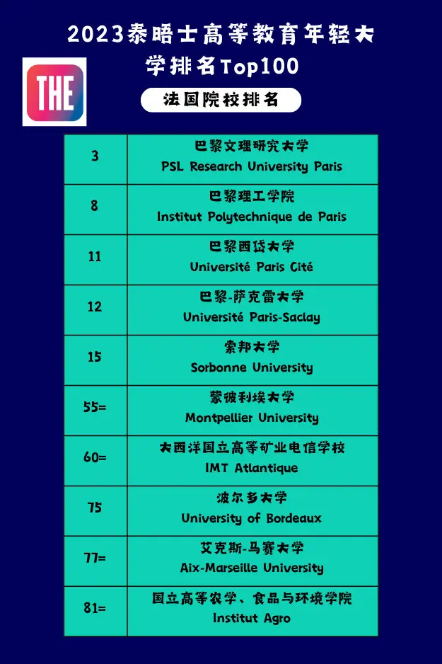 泰晤士高等教育报公布了 “最佳年轻大学排名″,法国成为世界前20名中代表院校最多的国家。