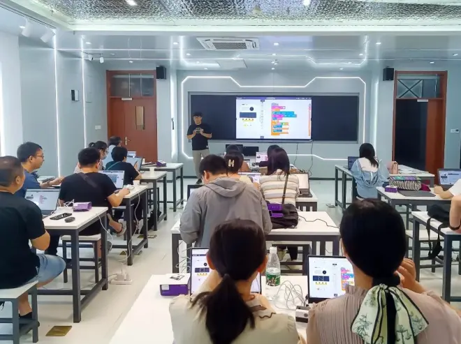 通过基于手写数字识别能够计算年龄的案例讲解和使用自主研发的图形化编程工具,帮助老师们了解硬件组成与AI功能,为老师们展示综合性的编程实践项目方法。带领大家利用小栗方对人工智能编程进行综合实践体验,感受人工智能为生活与学习发展带来的深刻影响。