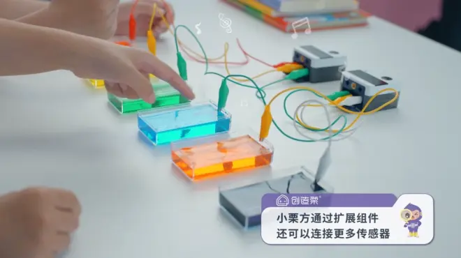 小栗方丰富的拓展功能,通过金手指、扩展板可以拓展多种传感器,通过Wi-Fi连接AIoT威栗物联物联⽹平台,可以实现多个设备数据的互联互通,帮助老师们轻松实现人工智能编程教学与学习,提供更多创意空间。在项目式实操体验过程中,老师们的想象力和创造力,得到了充分的发挥。