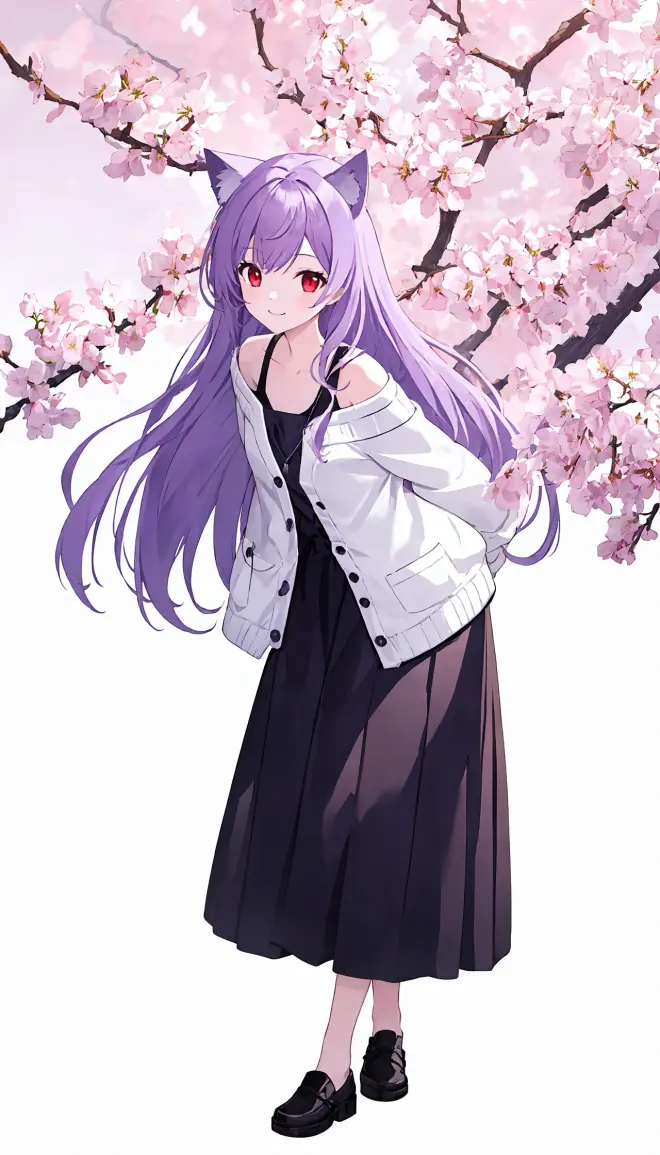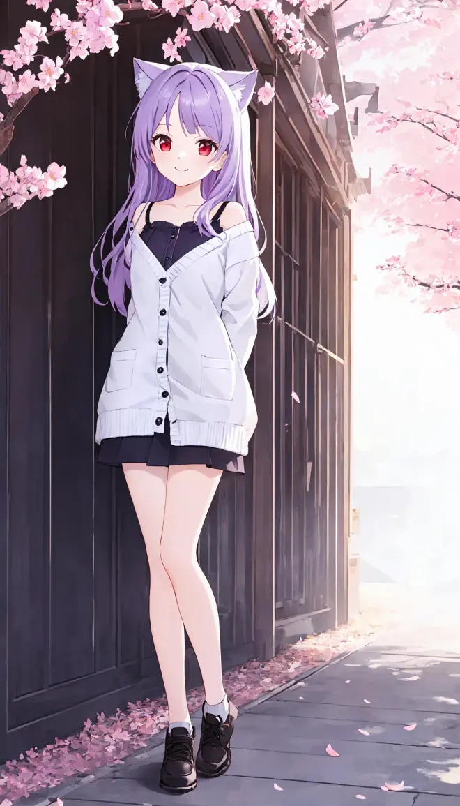 \[(solo), (1girl), (standing), leaning forward, arms behind back, (light_purple hair:1.3), (long hair:1.2), (diagonal bangs:1.2), (Straight hair:1.3), cat ears, *//*, (red eyes:1.25), clean eyes, beautiful eyes, *//*, (white cardigan:1.2) and off-shoulder and Bare shoulder and collarless, smile\],