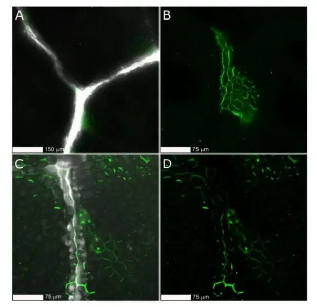 此外,当 dsRNA 被 CD 包被时,源自喷雾 dsRNA 的特定 siRNA 的丰度增加了 13 倍。在远端叶片中测定了系统性 dsRNA,当作为纳米复合材料递送时,其浓度显著增加。类似地,当喷洒 CD-dsRNA 纳米复合材料时,远端叶片中的全身性 siRNA 明显更丰富。此外,FITC 标记的 dsRNA 显示在质外体中积累,并在涂有 CD 时增加其进入植物的机会(图 2)。这些结果表明,通过水热合成获得的 CD 适用于 RNAi 植物应用中的 dsRNA 叶面递送。