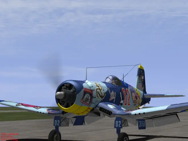 综上所述,F4U是二战战机中最理想的鸥痛机载体。虽然我手头有后期型的模组,但为了保证万无一失还是选用了早期型的来做。原计划基于F4U-1D,因为翼下的固定火箭弹发射架会影响效果,最后载体改为了F4U-1A型。因为是生贺痛机,打算特殊的搞四机差分,而且并非过往的机徽差分,而是完全独立的三个涂装。但最终只完成了三机(A号机SP机徽,B号机鸥萌空军.ver,C号机鸥萌航空.ver。三个涂装一天一架,我都有点怀疑我自己是不是苍厨了)这三架飞机在3月18日在伊江岛空军基地完成首飞。这些涂装都基于CASEY1976大佬所制作的CORSAIR V3.0涂装PSD制作,已授权他人修改,本人仅在可允许修改的图层制作涂装。