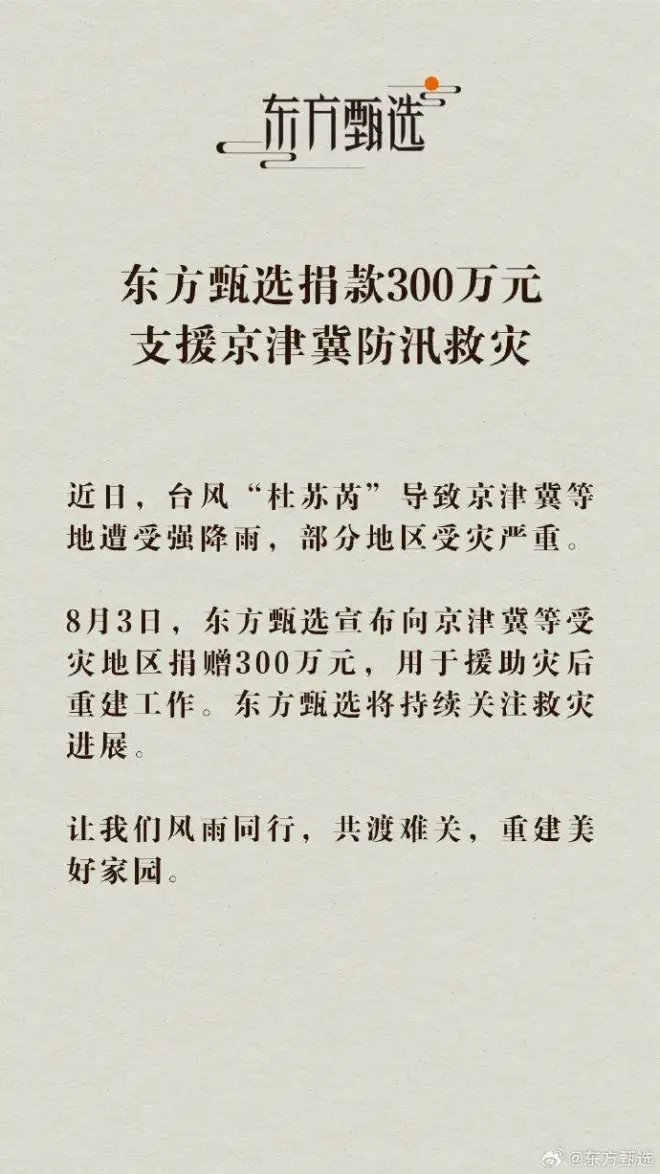 8月3日,东方甄选宣布向京津冀受灾地区捐赠300万元,用于灾后重建。