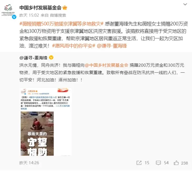 8月4日,薇娅丈夫董海锋在个人社交平台发文,称其与薇娅向中国乡村发展基金会捐赠200万元资金和300万元物资,用于受灾地区的紧急救援和恢复重建。董海锋还表示:“致敬所有奋战在防汛抗洪一线的人们,一切平安!河北加油!涿州加油!!”