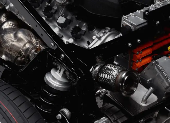 如果做插电式混动车,第一步要考虑的就是电池的位置,插混车型的电池较大,占据空间多,常见的家用车放置在车底,兰博基尼采用同样的思路,但电池包没有平铺在车底,而是放在了老款大牛放变速箱的位置,也就是车辆底盘的中央通道,这种设计不仅没有抬高超跑的坐姿,金属电池壳体还增加了底盘的刚性与扭转刚度。