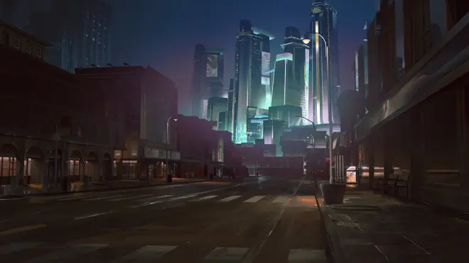 傍晚灯光亮起,晚霞将天染成粉红色,