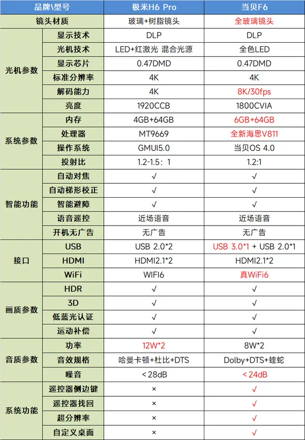 要说4K家用投影,今年当贝也发布了一款,型号是当贝F6,不走寻常路,采用的是华为全新海思V811芯片,色彩调教更是同价位画质天花板,先让我们看看参数对比表。