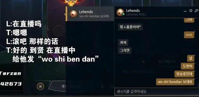 Tarzan在先前BP时遇到了炼金辅助,接着去对话框搜索Lehends,问是不是他。聊了一会儿后跟Lehends说Viper正在直播,去给他发woshibendan。