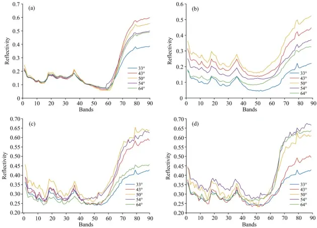 如图3所示,从实验结果中可以看出,四种研究对象的光谱曲线与太阳高度角的关系区别较大。在不同的太阳高度角光照射下,如图3(a)所示,绿色植被的光谱发生了变化。在449~689nm之间,绿色植被的光谱基本相似,但波长大于689nm,绿色植被的光谱曲线随着太阳高度角的变化较为明显,但其变化并非线性变化,基本规律是随着太阳高度角的升高反射比先升高,在43°时达到最大,随着太阳高度角进一步增大,绿色植被的反射比反而下降。迷彩雨衣的光谱曲线与其他材料较为不同[如图3(b)所示],基本随着太阳高度角的增大,迷彩雨衣的光谱整体发生了平移,在太阳高度角为50°左右时,整个波段的光谱强度都达到了最大值,并在太阳高度角进一步增大时,迷彩雨衣的光谱曲线强度下降。而两种绿色伪装板的光谱由于图中像素较少[如图3(c,d)所示],光谱曲线受到噪声的影响相比其他两种材料较明显,迷彩伪装板在可见光波段光谱曲线受太阳高度角变化的影响不很明显,但在近红外波段显现出了与绿色植被相同的变化规律,随着太阳高度角的增大,浅色伪装板的近红外波段光谱逐渐上移后下降,在50°左右达到峰值,深绿色则在54°时反射比达到最大。