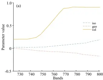 该模型将二向性反射分解为了各同向性反射、体散射和几何反射三部分的权重。其中R是二向反射率,θ是光线照射天顶角,是观测天顶角,σ是相对方位角。Kvol和Kgeo分别为体散射核和几何光学核。三个常系数只与波长有关,分别表示均匀散射、体散射和几何光学散射所占比例。