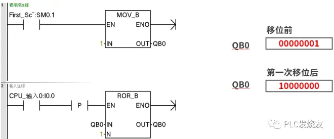 举例说明1:程序如图3-6,利用系统时钟SM0.1第一个扫描周期给QB0字节中赋值为1,此时QB0中最低位(Q0.0)为 1。当按下I0.0按钮后,QB0字节中的数据右移一位,Q0.7变为1。