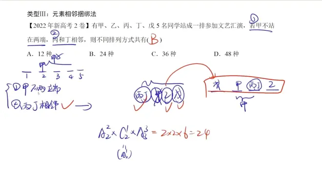 进行捆绑时别忘了将捆绑的元素再进行排列,这里丙丁捆绑,所以别忘了×A₂²