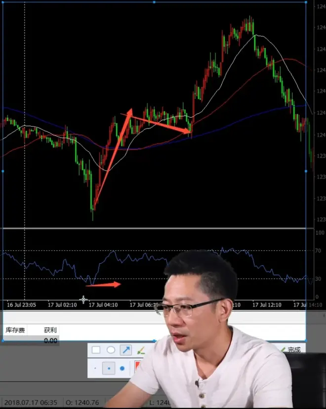 它是配合着咱们的K线来进行运行的,对吧?那么这个时候如果说我们按照上节课讲的K线和均线配合起来,同时我们又运用RSI指标来进行交易的话,那么这样的话等于什么?