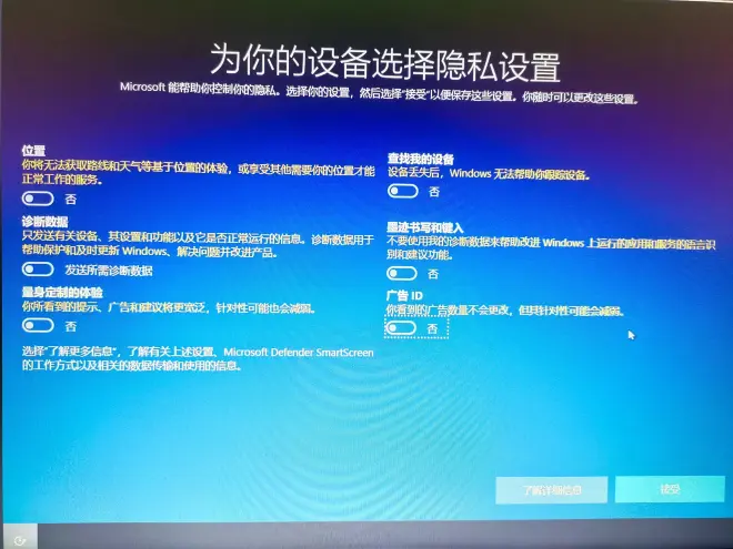 23、真是服了windows 10安装过程了,把所有全部关闭成【否】,保存继续。