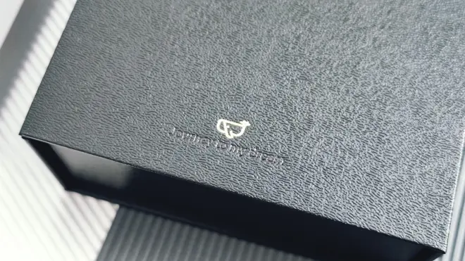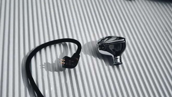 锐可余音SG01为全金属的入耳式可换线耳机,耳机头一打开包装就能看见拿海绵槽卡住。用手掂一掂,非常有分量。后腔面盖上也有设计,左右耳结合起来是一双鱼翅膀。