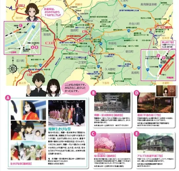 不过,《你的名字。》对《冰菓》圣地的位置进行了调整。《你的名字。》地点A被标在了河流西岸,大致是《冰菓》舞台探访地图的13号地点,即11话奉太郎与千反田在河岸边谈话的地方。但地点A文字描述中的饮茶店现实位置是在宫川东岸《冰菓》地图19号地点。
