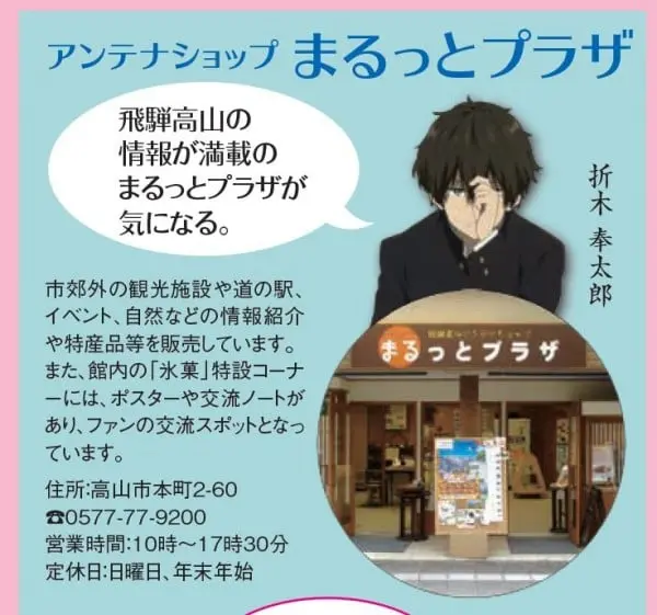 另外,《你的名字。》地点B的商店在《冰菓》地图中也以星号标注了(店名有所修改)。虽然不是动画取景地,但这家商店设有张贴了《冰菓》海报的专柜,并提供留言本给粉丝们交流。