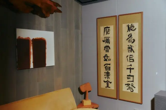 一张乔治·中岛的桌子上放着他的电脑工作站,后面是一幅尹亨根的抽象简画——只有三个鲜亮的色块。有一面墙上挂了20多件作品,其中很多都是20世纪韩国重要艺术家的作品,比如朴寿根、张旭镇和白南准。