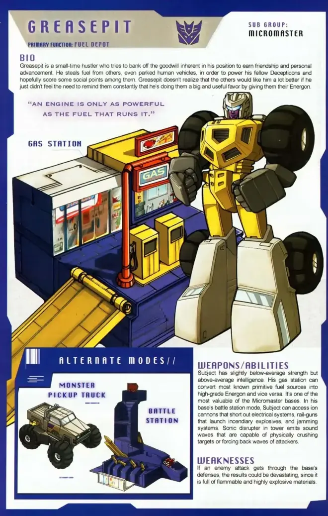 当霸天虎Decepticon\迪斯坦(狂派)Destron将军入侵战区时,加油站点基地\加油站基地\燃油基地Gasoline Base试图抵御恶棍。它从无害的加油站变成了一个巨大的火炮平台,并让霸天虎Decepticon\迪斯坦(狂派)Destron用一次又一次完全毫无意义的火力扫射。