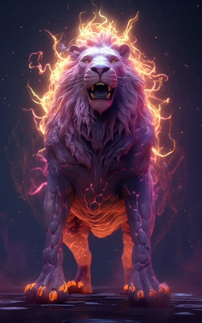 皮克斯风格,狮王全身,四条腿站立,灰尘颗粒和柔和的灯光,漫射光,雾,肖像,紫色,蓝色和橙色,错综复杂的金属设计,发光颜色,4k,史诗般的构图,黄金比例