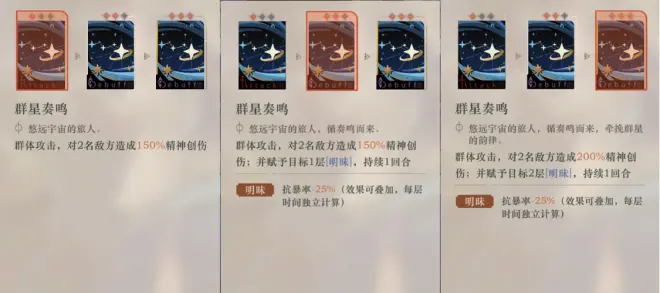 对群技能,释放时对敌方两名敌人造成150%/150%/200%的伤害。当技能卡牌2星以上时,对敌方施加1/2层【明昧】效果。【明昧】效果会令敌方的抗爆率降低25%,这意味着变相地提高了我方暴击率。