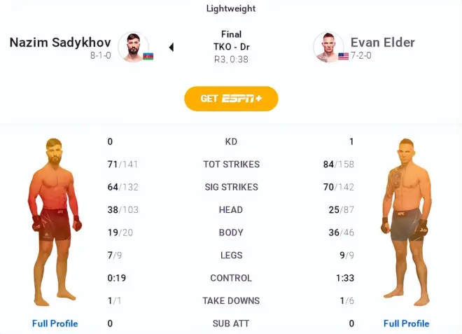 第三回合开场时刻,萨德霍夫防摔时的一次顶膝反击,将埃尔德右侧眉弓处撕开一道极深的伤口,场裁马克.史密斯(Mark Smith)反复仔细观察,决定叫停对战,经过场外医疗监督进场检查确认,宣布比赛终止,萨德霍夫以TKO方式赢得UFC首秀开门红。