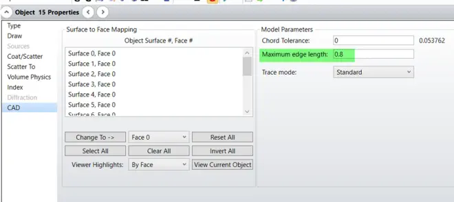 对于被用作探测器的 CAD 元件而言,被用作像素探测面的默认数值可能不足以提供准确记录数据所需的分辨率。通过修改 物体属性…CAD…最大边长(Object Properties…CAD…Maximum edge length)参数为默认值 0,我们可以缩小探测面/像素尺寸(并增加像素数量)。