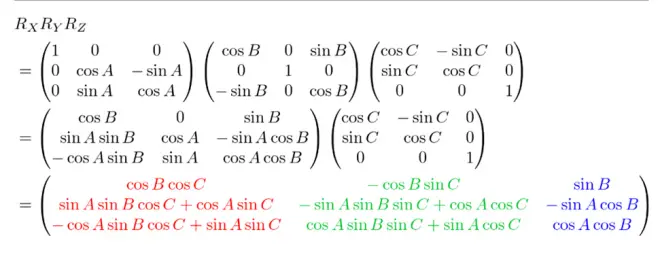 首先,我们需要确定系统中每个物体的旋转矩阵。如果未勾选 “物体属性…类型…使用全局 XYZ 旋转顺序” 选项,则使用以下公式计算物体的旋转矩阵,其中 A、B 和 C 是 NSCE 中列出的倾斜 X、Y、Z 角度。