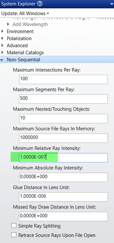 根据最小相对光线强度(Minimum Relative Ray Intensity)的默认设置,从 CAD 元件的膜层表面反射的光线在其功率降低至初始功率的0.1%(1e-3)以下时被终止。在我们对这个大功率激光器的分析中,即使功率阈值降低至初始功率相对较小的部分,每条光线所携带的能量仍然会导致系统加热,必须予以考虑。为避免这个阈值所导致的能量损耗,我们将最小相对光线强度(Minimum Relative Ray Intensity)设置为1.0000E-007。