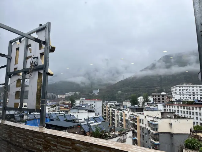后面回到串串店,又吃了一点,我们就撤了。结账的时候,老板不是数签子数量算钱,而是把我们的签子全部放到电子秤上,算签子的重量来算钱,四个人我们吃了390元,我觉得好贵啊,我大学去成都吃的串串也就40到50元诶。 回到路上发现有点小雨了,我们就打算打车回酒店,但是路过网吧的时候,我发现网吧开门了!我惊呼一声,甚至想做足球的庆祝动作了。真的非常高兴,罗老师也是,于是我们就直接在网吧下车了,开始夜生活。 第二天周六早上,徐老师在自己的房间通宵结束,约我7点30吃早饭,我说好。于是我们就7点半在酒店顶楼吃早饭了。这个自助餐厅需要早餐券才可以吃,虽然每个住客都有,但是我原来经常睡到十点多,而早餐只持续到9点30,所以之前一直没有认真吃过这里的早饭。一想到一个晚上要180元,我觉得这顿早饭不能再错过了,所以就答应共进早餐。周六的早晨也有小雨,天气挺冷,我们的早餐厅在一个露台边上,有很大的窗户,可以看到雨滴落在地上的波纹。远处的山腰间也有厚厚的云层,所以这顿早饭吃的也挺惬意的。