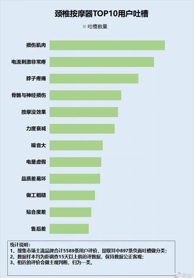 我在一个论坛上归纳了人们对颈部按摩器的负面评价,并将它们整理成了下面的图表,可以看出伤肌肉是最大槽点。为了更好地说明,我还总结了颈椎按摩器行业内的四种常见智商税。我建议大家认真阅读这些内容,以免购买低质量的按摩器!