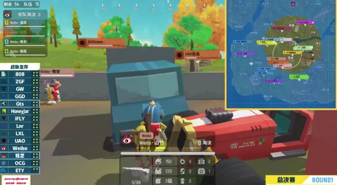 安全区刷新在了西南角,聚集在地图北部的队伍遭遇了天谴圈只能全力冲刺与时间赛跑。Weibo战队找到了绝佳的位置,身处安全区边缘的房区内直接卡住了其他队伍的进圈路线,Weibo山竹直接一梭子弹扫车打爆了808战队的载具,车上两人直接被淘汰。